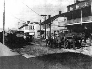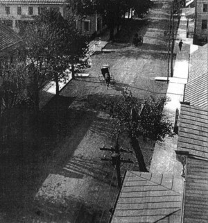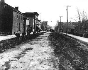 King (Main) Street East, Strasburg, Virginia. Looking east on King street. The brick house on the right side of the street was owned by Dr. White. The next house on that side was the Zea house. The Strasburg Post Office was probably still located in the Shenando Building at this time but was later build on the immediate left side of the street and still stand there. This picture was likely taken just prior to 1920. |