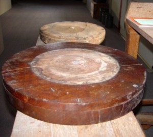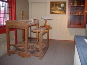 Pottery Turntable from the Bell Family. late 1800s. This round platform was the top working surface of a potter's wheel used in the Bell Pottery (S. Bell and Sons) on Queen Street in Strasburg. Mrs. Loraine Bell, daughter-in-law of Charles "Polk" Bell and wife of the late Frank Bell, generously donated this item to the Strasburg Museum. |